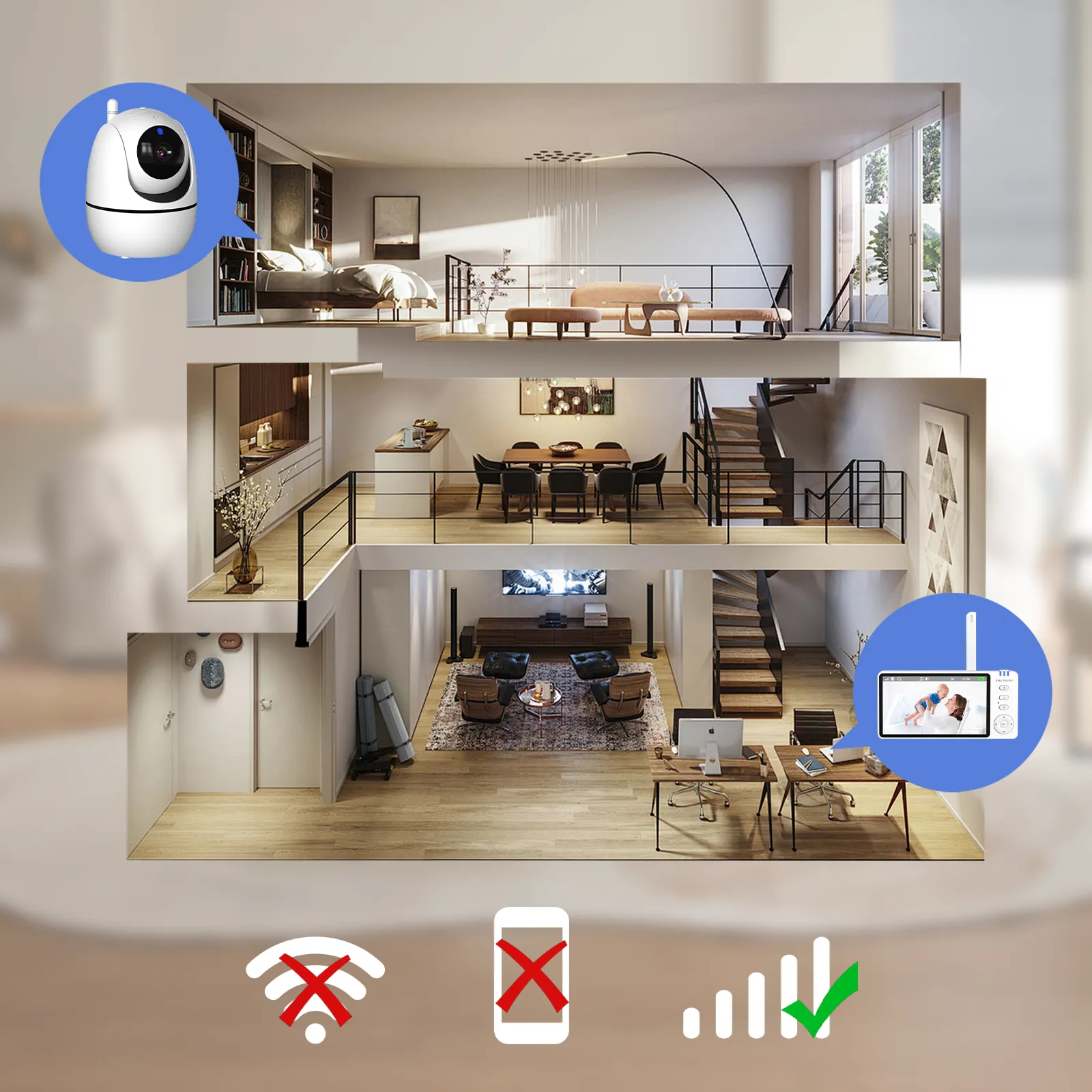 The Denvoro Baby Monitor uses 2.4G wireless technology to provide a stable and reliable connection, effectively avoiding Wi-Fi signal interference. This ensures a smooth, lag-free transmission of video and audio. This secure, independent connection doesn't require a home Wi-Fi network, offering true plug-and-play simplicity and safeguarding your family's privacy.